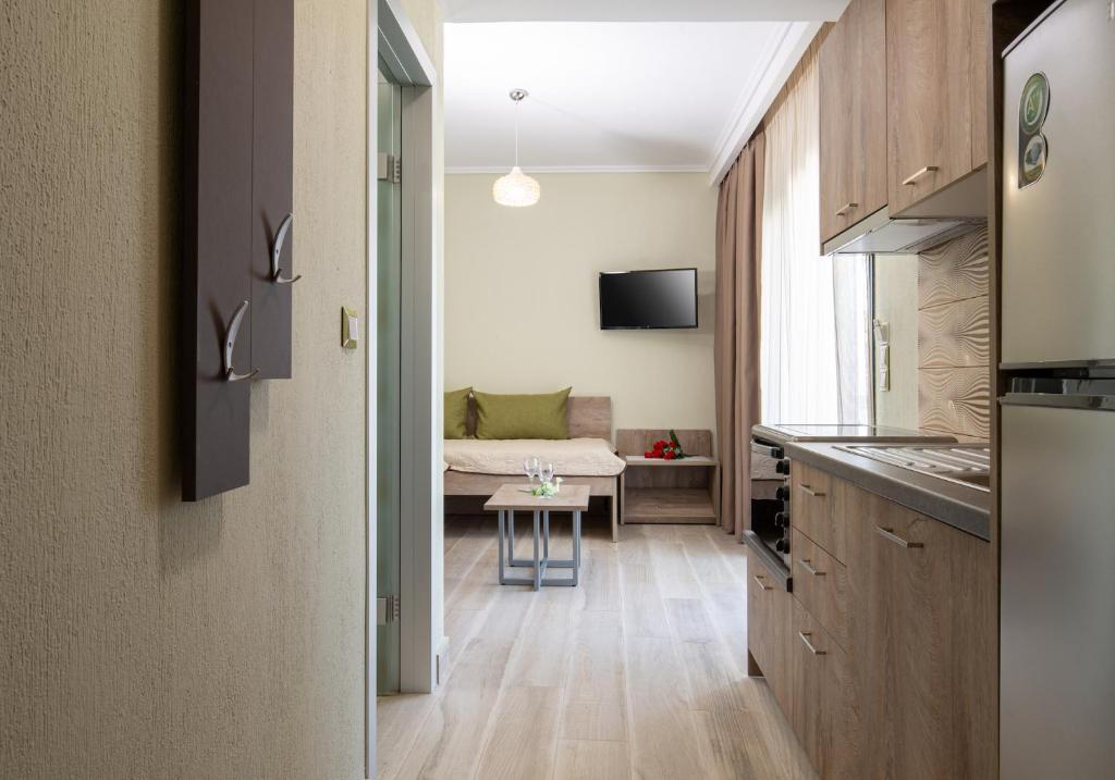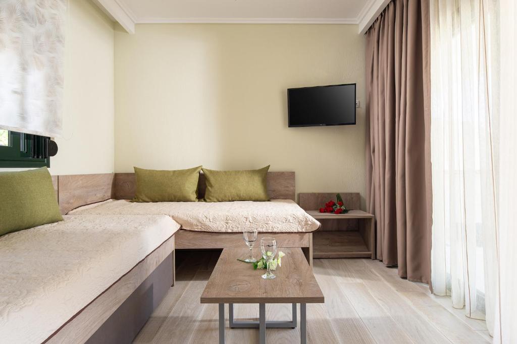 Όλα τα Δίχωρα Δωμάτια με Θέα Κήπο και Πισίνα αποτελούνται από δύο χώρος με δύο μονά κρεβάτια-καναπέδες το ένα δωμάτιο-σαλόνι και ένα διπλό κρεβάτι στο υπνοδωμάτιο,εξοπλισμένη κουζίνα ,τηλεόραση LED στο σαλόνι, μαρμάρινο μπάνιο με ντουζιέρα, πλήρως επιπλωμένο μπαλκόνι.